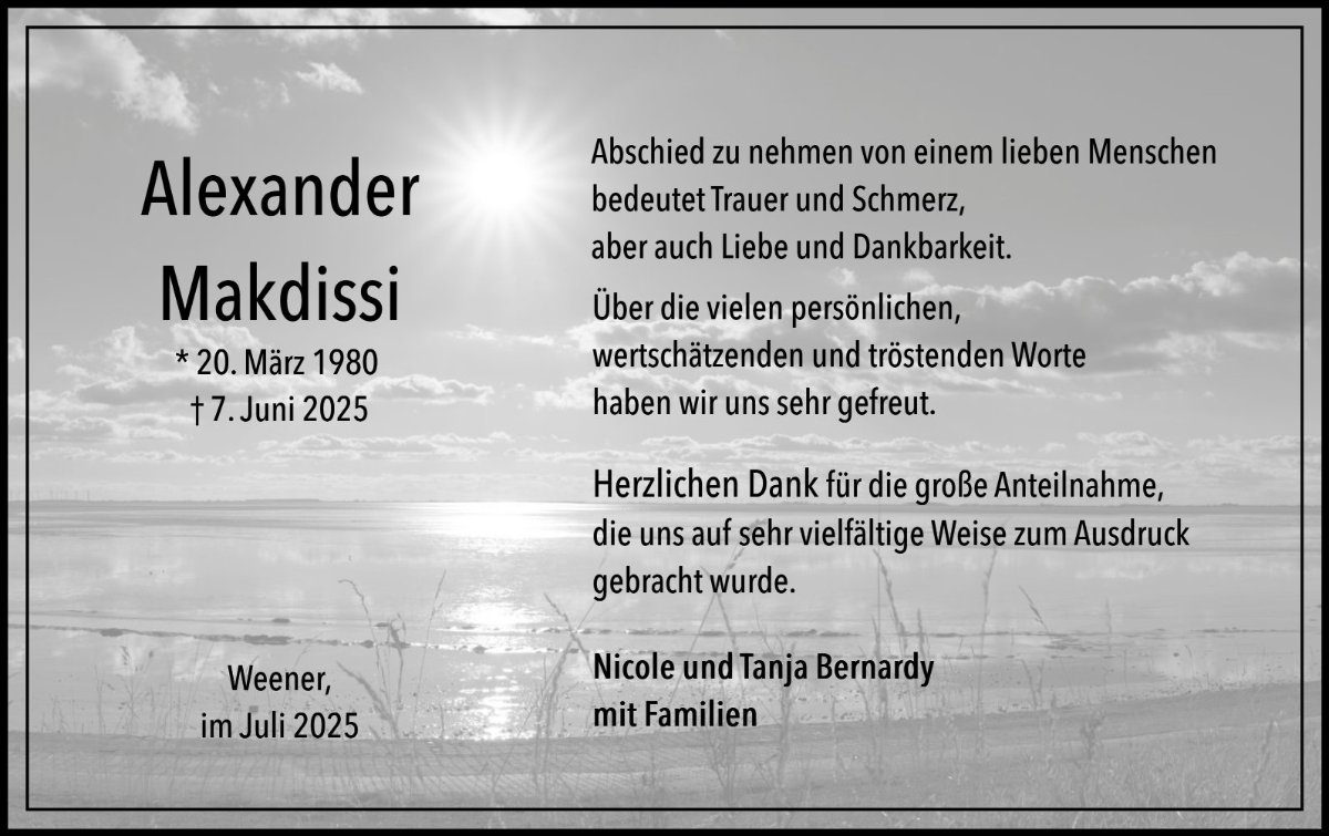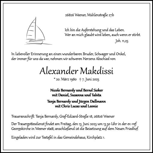 Lieber Alex, leider haben wir uns nie persönlich getroffen, aber in unseren vielen Telefonaten waren wir uns sehr verbunden. Ich werde dein Lachen vermissen. Wo immer Du jetzt auch bist, soll der Ort so sein wie Du es Dir immer gewünscht hast.