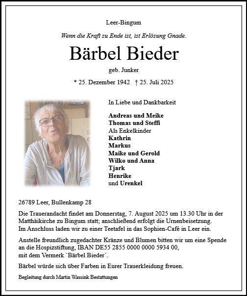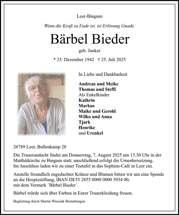 Ich möchte mein herzliches Beileid aussprechen und ihnen als Familie viel Kraft wünschen, diese schwere Zeit der Trauer zu bewältigen.