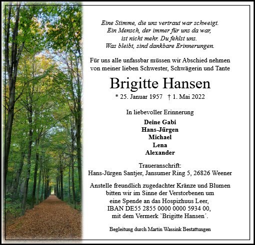 Ich möchte den Angehörigen von Gitti mein aufrichtiges Beileid aussprechen. Sie war lange Jahre eine Kollegin bei der OVB Leer. Ihre liebenswürdige Art bleibt unvergessen. Ihr viel zu früher Tod macht mich sprachlos.