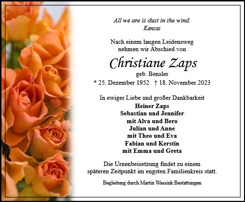 es tut mir sehr leid, dass Du und Deine Jungs - und natürlich auch die Schwiegertöchter und die Enkelkinder - Abschied von Christiane nehmen musstet.