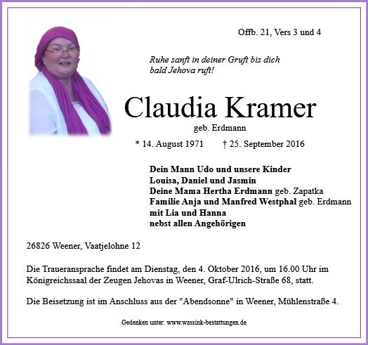 Lieber Udo, ich möchte Dir sagen wie unendlich leid es mir tut, dass Ihr ,du und deine 3 Kinder, Claudia so früh verloren habt. Ich kenne sie seitdem sie ein Teenager war und sie war mir sehr ans Herz gewachsen. Sie hatte immer gute Laune und dachte immer positiv, was nicht immer einfach war. Sie war ein herzensguter Mensch und hat sicher einen grossen Anteil daran, dass ihr 3 wundervolle Kinder habt. Aber wir freuen uns alle darauf Claudia wieder zu sehen. Unser Schöpfer wird sie garantiert wieder leben lassen. Ich bin in Gedanken und im Gebet bei Euch. Susanne