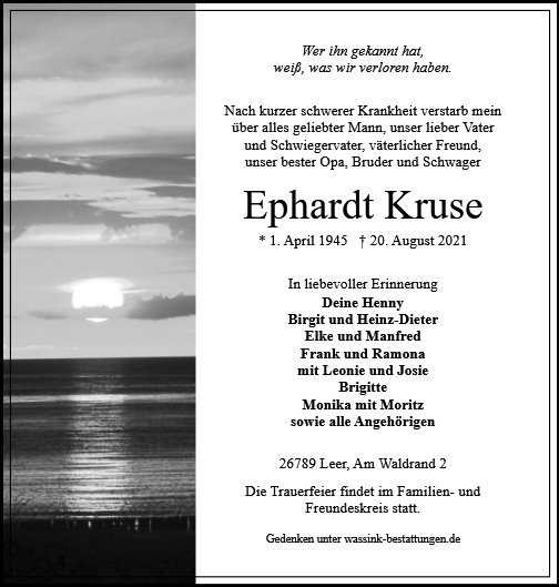 Liebe Henny und Familie, in stillem Gedenken an Ephardt übermitteln wir unsere Aufrichtige Anteilnahme. Wir wünschen Kraft und Trost für die Zukunft ohne Ephardt. Mit stillem Gruß sind unsere Gedanken bei euch. Harm und Helene Graalmann, Ihrhove.