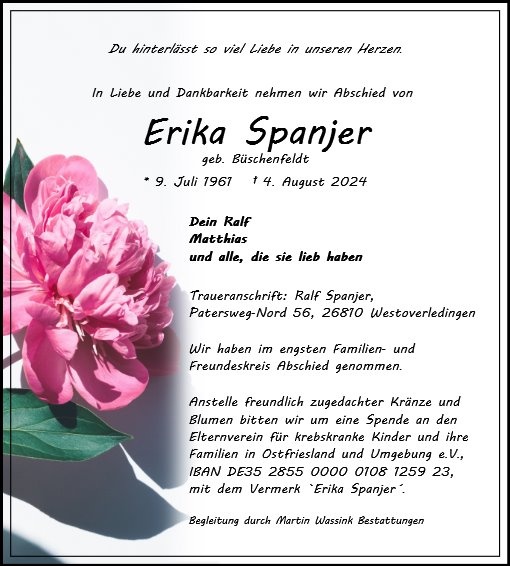 Wir alle haben mit Ihrer wundervollen Frau und Mutter einen wertvollen Menschen verloren, einen Menschen, der sich immer zuverlässig und mit ganzem Herzen für seine Mitmenschen eingesetzt hat. Wir werden Ihre liebe Frau für immer in bester Erinnerung behalten. Ihr Lachen und ihre lebensfrohe Art werden wir nie vergessen. Sie war einer der liebenswürdigsten Menschen, die wir kennenlernendurften. Wir sind unendlich dankbar dafür und werden sie für immer in unsere Herzen behalten.