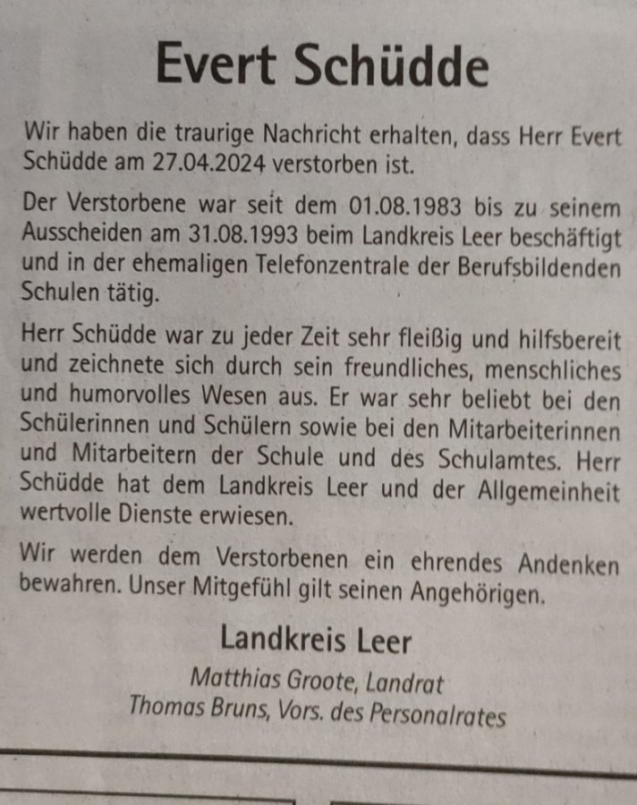 Evert Schüddegestorben am 27. April 2024
