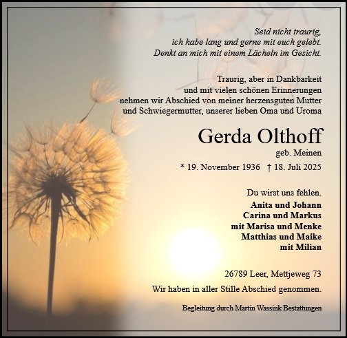 wir wünschen Ihnen für die kommende Zeit viel Kraft und dass es Ihnen gelingt, dankbar auf die positiven Erinnerungen zurückzublicken. Diese Gedenkseite möge Ihnen dabei helfen, Ihre Trauer zu teilen und das Andenken gemeinsam wachzuhalten.