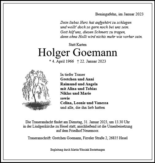 wir wünschen Ihnen von Herzen viel Kraft, dass Sie Menschen um sich haben, die Ihnen in dieser schweren Zeit beistehen und Halt geben. Zusätzlich können Sie auf dieser Gedenkseite Erinnerungen teilen und so das Andenken gemeinsam wachhalten.