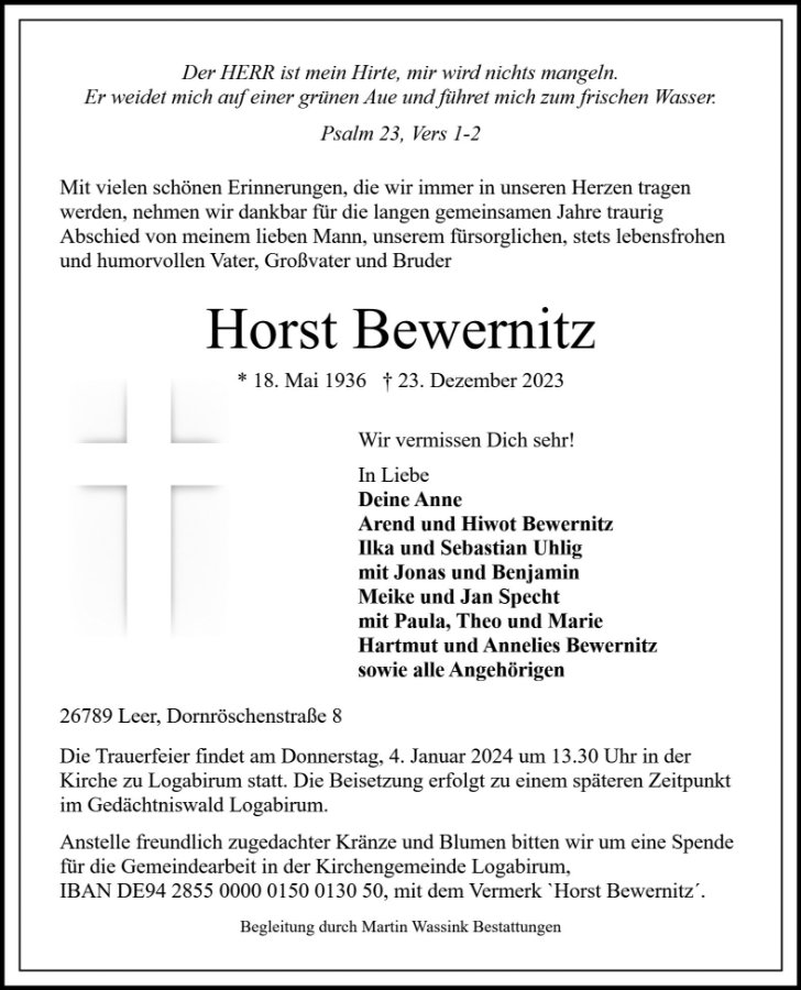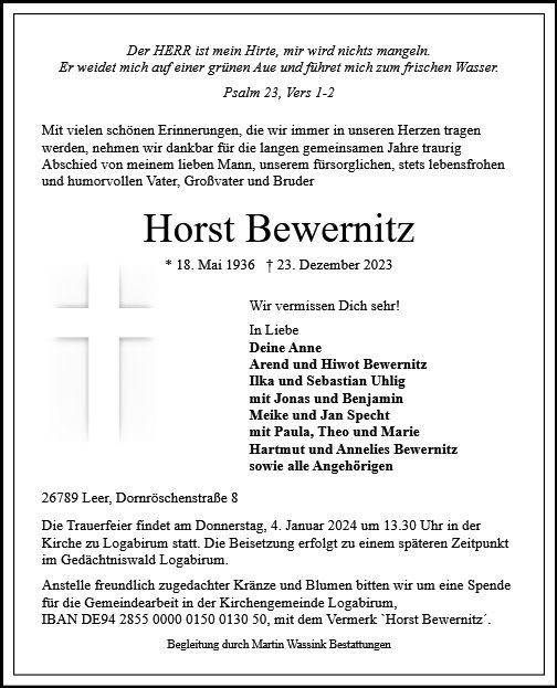 Das nun bringt mich dazu, Ihren Namen zu googeln und ich muss zu meiner Bestürzung feststellen, daß Ihr Mann und Vater verstorben ist. Auch wenn es schon eine Weile her ist, gestatten Sie mir, Ihnen noch herzlich zu kondolieren! Ist mir doch Horst Bewernitz als sehr freundlicher, entgegenkommender Mann in Erinnerung.
