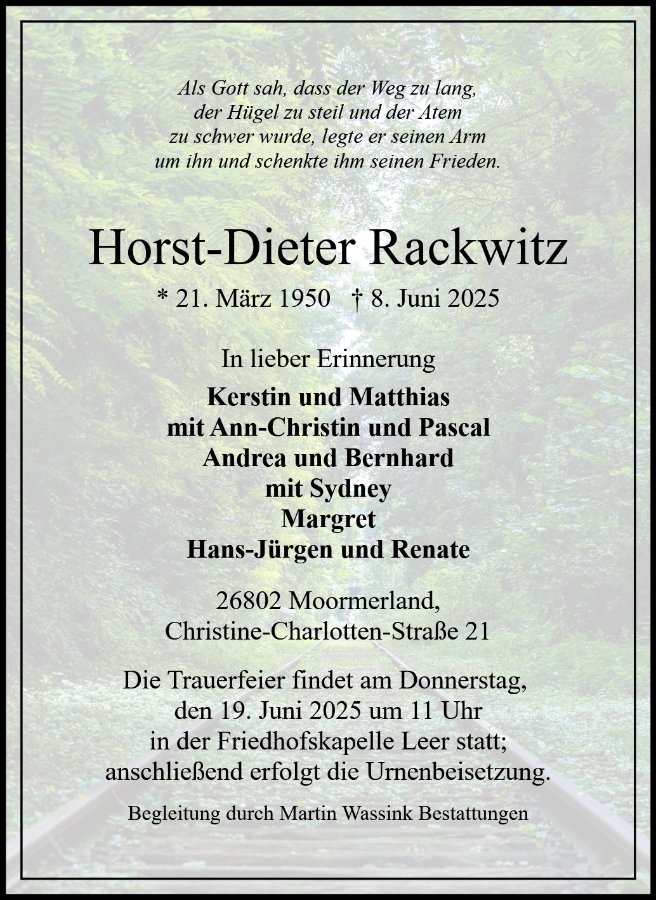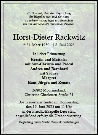 wir wünschen Ihnen von Herzen viel Kraft, dass Sie Menschen um sich haben, die Ihnen in dieser schweren Zeit beistehen und Halt geben. Zusätzlich können Sie auf dieser Gedenkseite Erinnerungen teilen und so das Andenken gemeinsam wachhalten.