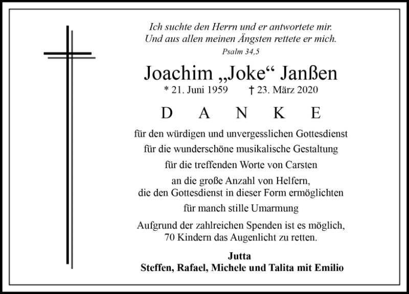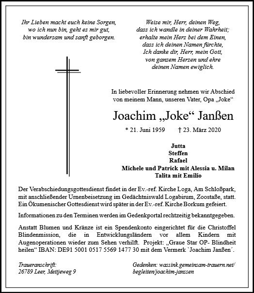 Joke wurde am 19.06.2020 im kleinen Kreis (coronabedingt) im Gedächniswald in Logabirum beigesetzt. Danke an EO, der als Freund, die Andacht hielt.
