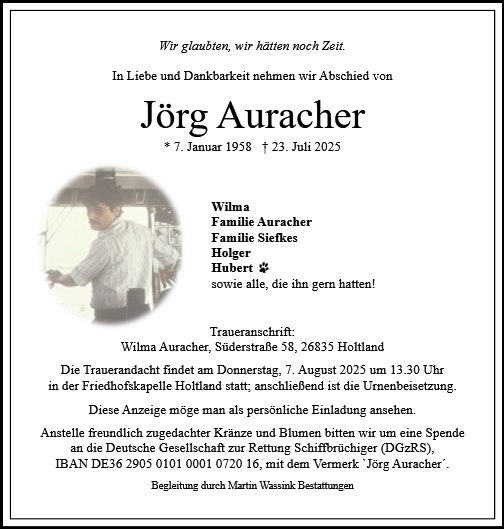 Lieber Jörg, mit großer Bestürzung haben wir heute erfahren müssen, dass Du Dich von Wilma, Deiner Familie und Deinen Freunden mit Blick auf das irdische Leben verabschiedet hast, dass dies viel zu vorzeitig war, muss hier nicht weiter erwähnen. Ich bin so froh, Dich bei meinem Besuch bei Euch am 23.04.2025 noch einmal erleben zu dürfen, so wie ich Dich kannte und als alten Freund geschätzt habe, wie auch in ewiger Erinnerung behalten werde…