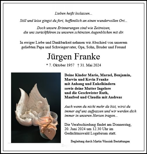 wir wünschen Ihnen von Herzen viel Kraft, dass Sie Menschen um sich haben, die Ihnen in dieser schweren Zeit beistehen und Halt geben. Zusätzlich können Sie auf dieser Gedenkseite Erinnerungen teilen und so das Andenken gemeinsam wachhalten.