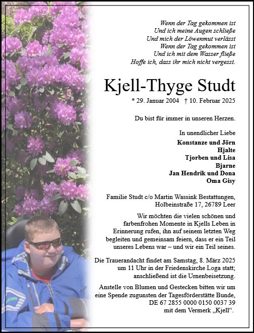 in diesen Tagen fühlen wir mit Ihnen und wünschen Ihnen von Herzen, dass Sie aus den glücklichen Erinnerungen Kraft schöpfen, um positiv in die Zukunft zu gehen. Diese Gedenkseite möge Ihnen dabei helfen, Ihre Trauer zu teilen und das Andenken gemeinsam wachzuhalten.