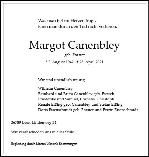 wir möchten Ihnen und Ihrer Familie unser herzliches Beileid aussprechen. Leider haben wir uns in den letzten Jahren nur wenige Male gesehen, aber ich denke an jedes Zusammentreffen mit Ihnen und Ihrer lieben Frau sehr gerne zurück. Ich behalte ihre Frau als warmherzigen, positiven Menschen in Erinnerung mit einer ansteckenden Fröhlichkeit und Lebensfreude. Ich weiß, dass meine Eltern in ihr eine treue, liebe Freundin hatten.
