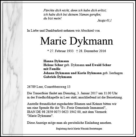Wir moechten hiermit unser Beileid aussprechen und uns mit Freuden an Marie erinnern.Sie ist jetzt erloest und lebt in unseren Herzen weiter.Sie war ein sehr froehlicher Mensch und wir danken unserem Herrn dass wir sie kennenlernen und lieben durften.