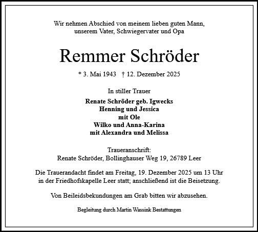 Wir gedenken Remmer in großer Dankbarkeit und sind in Gedanken bei seiner Familie.