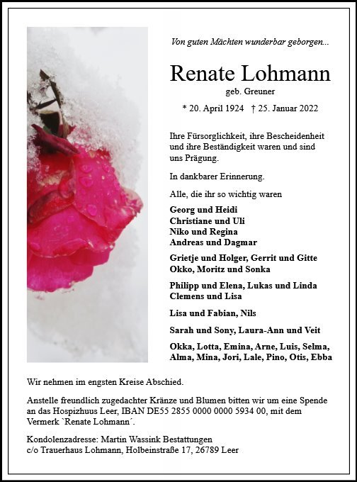 in dieser Zeit des Schmerzes wünschen wir Ihnen Kraft, den Verlust im Kreise Ihrer Liebsten zu verarbeiten. Als Zeichen unserer Anteilnahme und des Gedenkens entzünden wir dieses erste Licht. Möge diese Gedenkseite Ihnen helfen, Erinnerungen zu teilen und so das Andenken gemeinsam wachzuhalten.