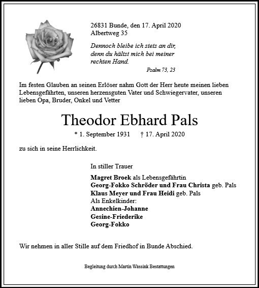 wir wünschen Ihnen von Herzen viel Kraft, dass Sie Menschen um sich haben, die Ihnen in dieser schweren Zeit beistehen und Halt geben. Zusätzlich können Sie auf dieser Gedenkseite Erinnerungen teilen und so das Andenken gemeinsam wachhalten.