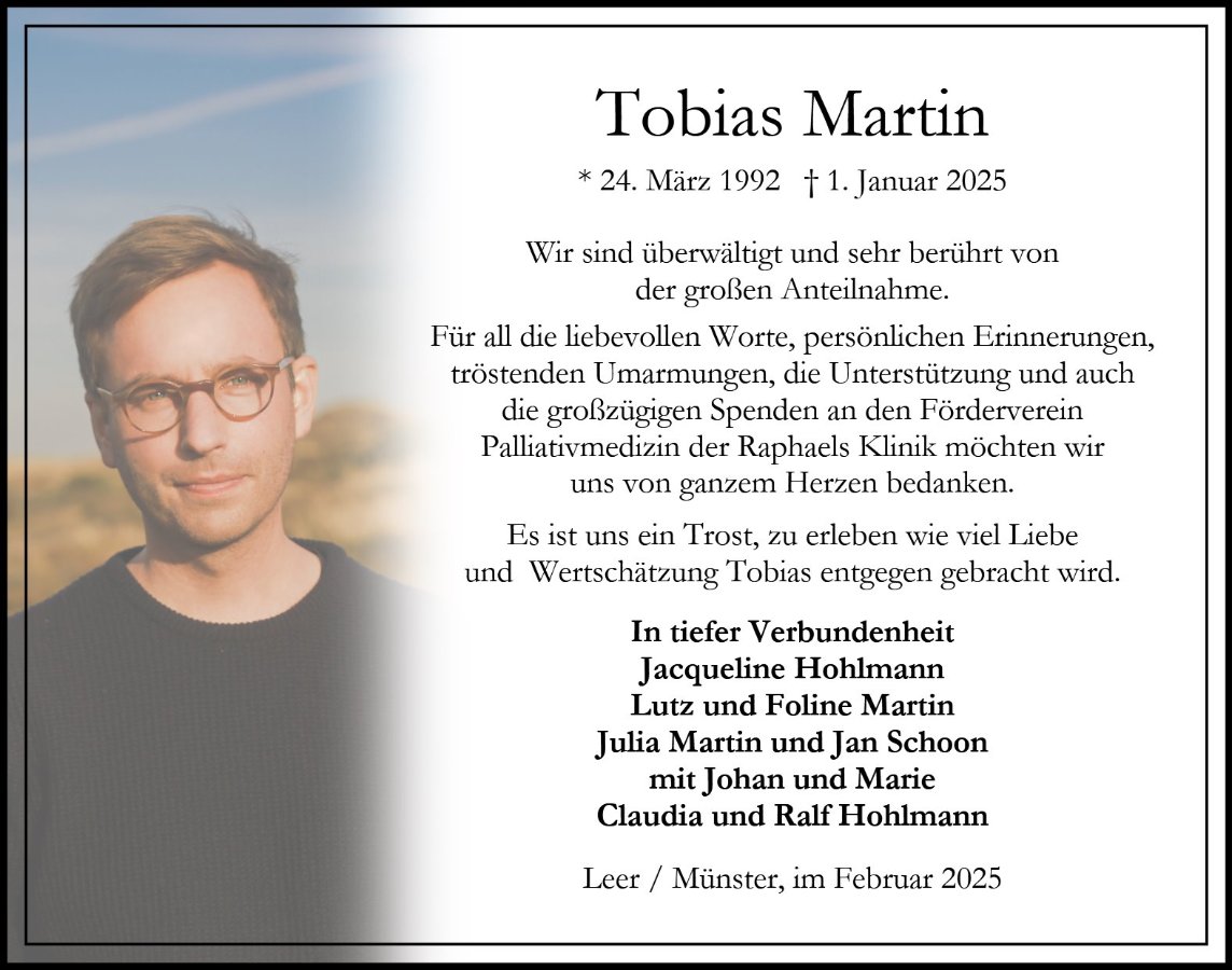 wir wünschen Ihnen von Herzen viel Kraft, dass Sie Menschen um sich haben, die Ihnen in dieser schweren Zeit beistehen und Halt geben. Zusätzlich können Sie auf dieser Gedenkseite Erinnerungen teilen und so das Andenken gemeinsam wachhalten.