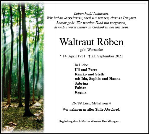 wir wünschen Ihnen von Herzen viel Kraft, dass Sie Menschen um sich haben, die Ihnen in dieser schweren Zeit beistehen und Halt geben. Zusätzlich können Sie auf dieser Gedenkseite Erinnerungen teilen und so das Andenken gemeinsam wachhalten.