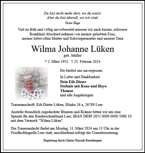 Der Familie Lüken wünschen wir sehr viel Kraft für die kommende Zeit.